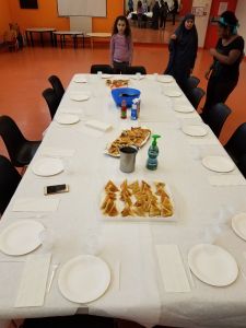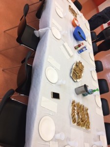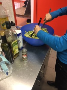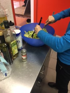 Pendant que les Samoussa cuisaient, un groupe s’est chargé de la préparation de la salade. Pour cela nous avons utilisés de l’huile d’olive et du vinaigre et ensuite nous avons mélangé le tout dans un saladier. Et un autre groupe s’est chargé de la décoration de la table et de la mise en place des couverts.