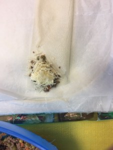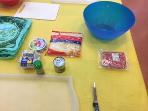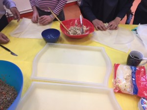 Dans un premier temps nous avons disposés sur table des carottes, de la ciboulette, des œufs (que nous avons battu dans un bol), du thon en boite, des champignons en boite, des petits pois en boite, un sachet de 500g de gruyère, de la vache qui rit, chair à saucisse, sel, poivre, piment doux, curry, du haché de bœuf, la mascarpone et des feuilles de bricks. Nous nous sommes scindé en trois groupes : le groupe « thon », le groupe « haché de bœuf » et le groupe « chair à saucisse ».
