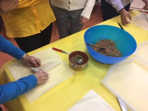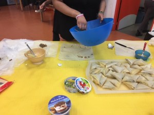 Nous avons par la suite garnies les feuilles de bricks tout en discutant. Nous avons dispatché les Samoussa sur 3 grands plateaux afin de distinguer ceux au thon, haché de bœuf et chair à saucisse.