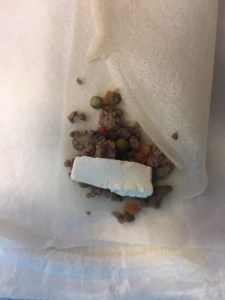 • Garnir les feuilles de bricks d’haché de bœuf tout en ajoutant du gruyère et un morceau de vache qui rit.