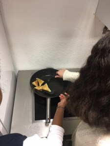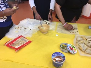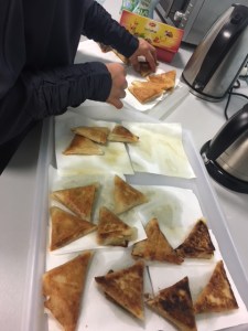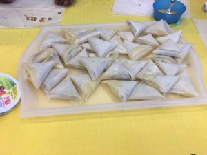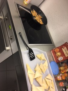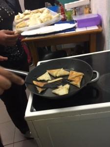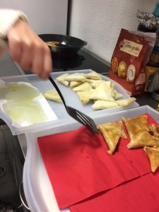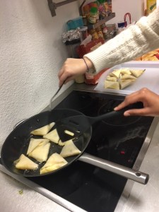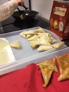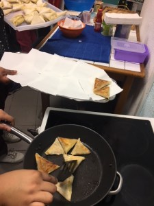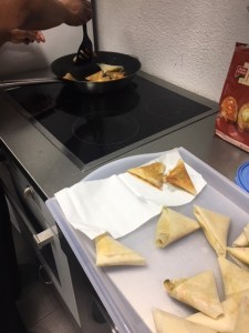 Nous nous sommes par la suite dirigés vers la cuisine pour commencer la cuisson des Samoussa. Nous sommes relégués pour pour pouvoir mettre sur des plateaux différents les samoussa aux différents goûts pour que ça ne se mélanges pas.
