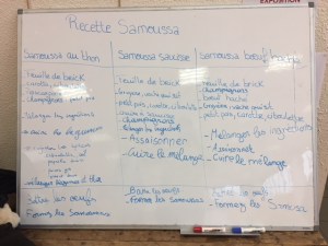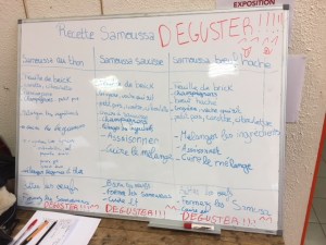 Pour commencer nous avons posé un tableau sur une table en bois afin de pouvoir écrire les étape de la recette au fur et à mesure de l’avancement de la préparations des garnitures pour faire les faire Samoussa. Nous avons décidé que chaque participant à l’atelier devait écrire aussi une étape sur le tableau afin de les faire participer activement à l’activité.