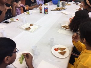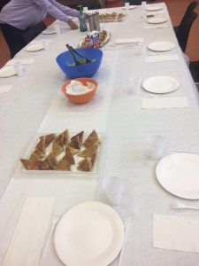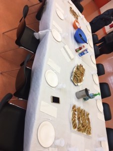 A 10h05 nous avons accueilli les participants à l’atelier cuisine japonaise, pour leur présenter les recettes des Samoussa aux 3 saveurs. Après que nous ayons tout  expliqués, nous avons mis sur la table les différents aliments et assaisonnements dont nous avions besoins pour réaliser ces recettes.