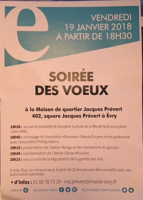 Apres avoir installé l’exposition en matinée à la maison de quartier Jacques Prévert nous sommes partis pour revenir à 18h15 pour participer à la soirée des vœux ou a lieu la présentation de l’exposition de l’atelier manga.
