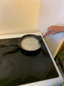 Etape 4 : Dans une casserole, verser le sucre avec l’eau et mélanger sur feu moyen jusqu’à ce que le caramel apparaisse. Une fois cuit, versé le caramel dans le moule (attention il faut que le caramel couvre tout le moule pour la caramélisation des ananas. Quand il couvre à peu près toute la poêle mettre les rondelles d’ananas.