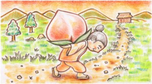Le grand-père et la grand-mère n’avaient pas d’enfant, et ils remercièrent la providence de leur avoir envoyé ce petit garçon. Comme il était né dans une pêche, ils décidèrent de l’appeler Momotaro, ce qui signifie « l’enfant né dans une pêche ». La grand-mère prépara un repas et fit manger l’enfant. Il mangeait voracement et grandissait à vue d’œil. Le grand-père et la grand-mère étaient bien surpris! Momotaro devint bien vite grand et fort.