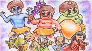 Sur l’île se trouvait un grand château dont la porte était fermée. Le singe grimpa lestement par-dessus et ouvrit de l’intérieur. Momotaro entra alors, et s’adressa aux vilains brigands (démons) qui ripaillaient : » Je suis Momotaro, et je suis venu vous punir de vos mauvaises actions. »