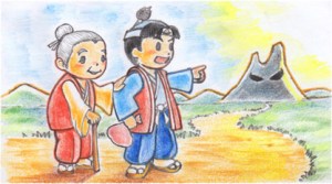 Le jour suivant, ils revinrent inviter Momotaro : « Momotaro, si tu venais avec nous ramasser des fagots dans la montagne? « , mais celui-ci répondit : » Je n’ai pas de sandales, je ne peux pas aller avec vous. »