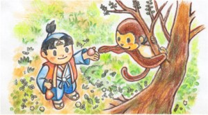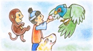 Momotaro toucha son baluchon et regarda le singe en lui disant : » Les meilleurs gâteaux de millet du Japon. » » Donne-m’en un, et j’irai avec toi. » lui proposa le singe.