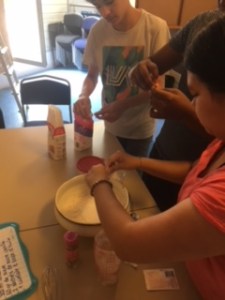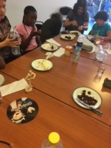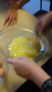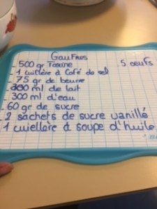 Dans un second temps nous avons procédé au mélange des ingrédients et à la cuisson en groupe et nous nous sommes relégués pour écrire les étapes de la préparation sur le tableau. C’était assez amusant et convivial.