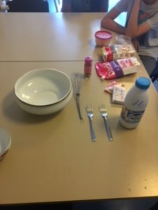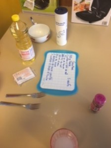 Pendant que les Samoussa cuisaient, un groupe s’est chargé de la préparation de la salade. Pour cela nous avons utilisés de l’huile d’olive et du vinaigre et ensuite nous avons mélangé le tout dans un saladier. Et un autre groupe s’est chargé de la décoration de la table et de la mise en place des couverts.