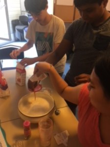 Par la suite, nous avons distribué 2 gaufres à chacun des participants tout en leur donnant une feuille de papier cuisson, un gobelet, un colorant alimentaire au choix, chocolat au lait ou chocolat blanc au choix.