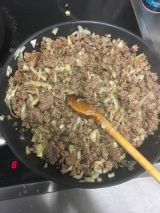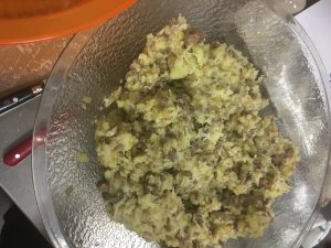 4ème étape : Mélangez la purée, la préparation de viande que vous avez laissé reposer, les 500gr d’emmental râpé, 3 cuillère à soupe de sauce soja sucrée, 1 pincée de curry, 1 pincée de poivre.
