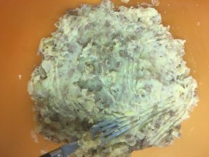 3ème étape : Faites cuire les pommes de terre entières sans les éplucher (astuce cela vous permet par la suite d’éplucher sans trop d’effort) dans une grande casserole d’eau bouillante salée (ou mettez 2 morceaux de Kub or) pendant  30 min. Une fois les pommes de terre cuites enlevez les de la casserole et commencer à les éplucher. Prenez un grand saladier et écraser grossièrement les pommes de terre jusqu’à ce que celles-ci deviennent de la purée.