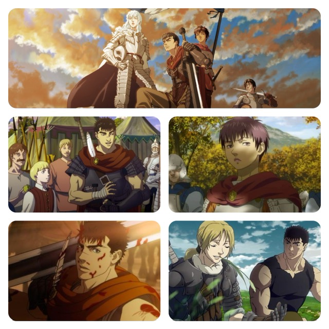 L’anime est ainsi le récit de l’ascension et de la chute de la Troupe du Faucon, et de la relation entre Guts et Griffith, particulièrement complexe, entre relation d’intérêt (Griffith utilise la force de Guts), respect mutuel (les deux se considèrent mutuellement en tant que soldats), et affection profonde (chacun a besoin de la présence de l’autre de façon inexplicable).