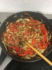 Etape 4 : Dans une poêle, faites revenir à feu doux les lamelles d’oignons tout en ajoutant 2 grandes cuillères à soupe de sauce soja sucré. Laissez mijoter les oignons pendant 5 minutes puis ajoutez 1 ou 2 œufs battus et laissez cuire brièvement sans remuer. Sachant que les japonais apprécient l’œuf encore un peu cru, vous pouvez ajuster la cuisson à votre convenance. Renouvelez de nouveau la même préparation selon le nombre de personnes qui mangeront. Pour nous il a fallut le faire 12 fois mais nous l’avons fait chacun notre tour !