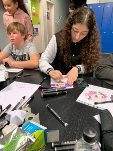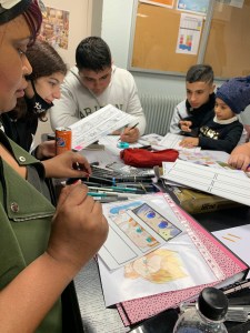 Pour que les marques pages manga soient faciles à faire nous avons au préalable mis en forme les feuilles cartonnées tout en faisant des délimitations pour donner la forme de marque page. Une fois fait, nous avons mis à disposition des exemples de dessin chibi comme Naruto, Pokémon etc… Nous avons aussi laissé le choix aux personnes de faire preuve de créativité en faisant des marques pages avec leur propre style de dessin.